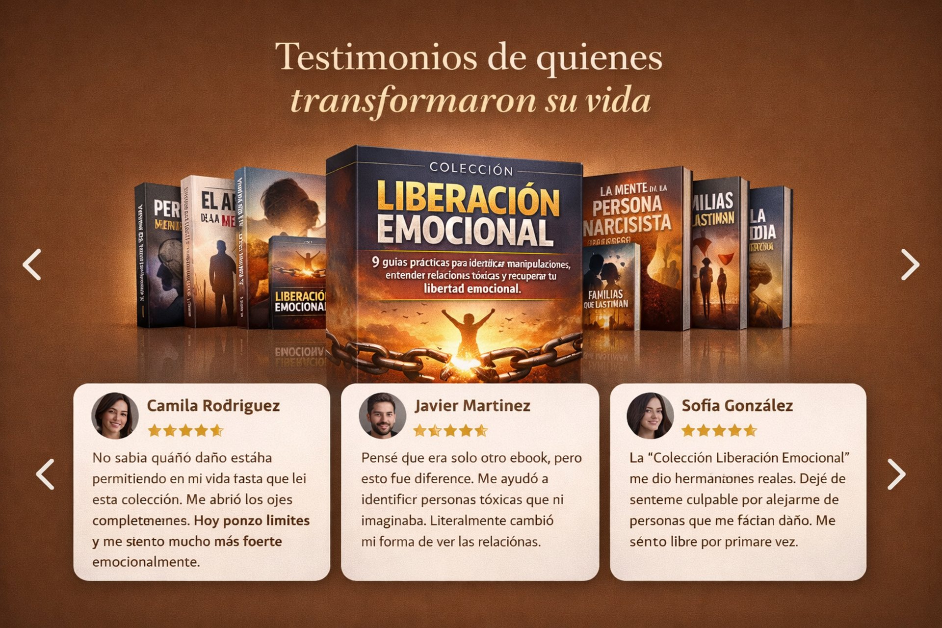 Al adquirir la COLECCIÓN LIBERACIÓN EMOCIONAL hoy mismo, desbloquearás GRATIS 4 bonos premium que te mostrarán cómo detectar, enfrentar y liberarte de personas narcisistas antes de que vuelvan a destruir tu vida.