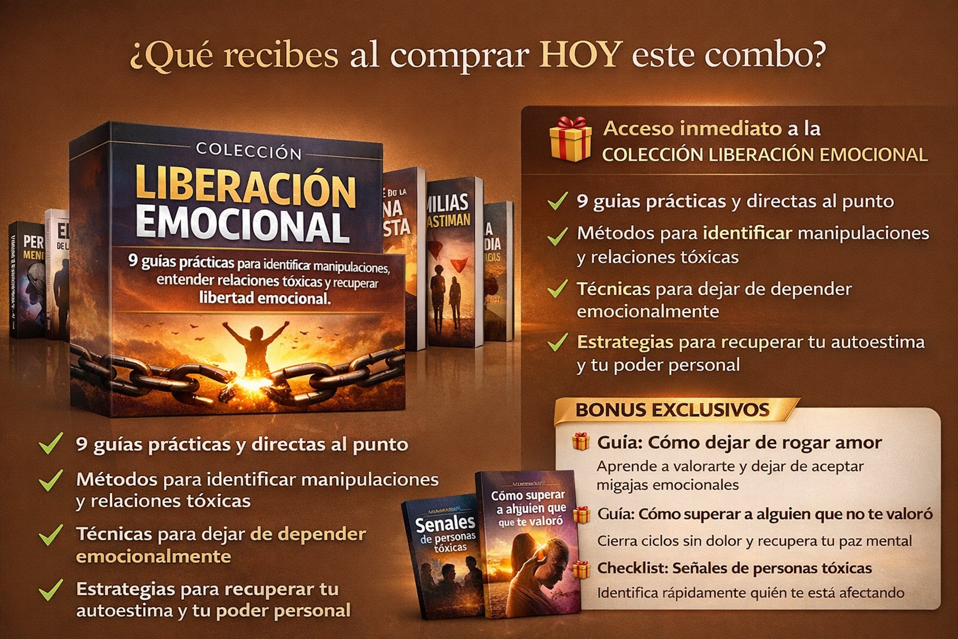 La COLECCIÓN LIBERACIÓN EMOCIONAL es un conjunto de guías prácticas diseñadas para ayudarte a reconocer relaciones tóxicas, romper con la dependencia emocional y reconstruir tu autoestima desde cero.